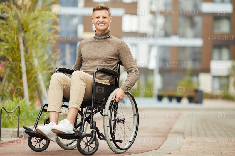 Портрет веселого, взволнованного красивого молодого мужчины-инвалида, сидящего на инвалидной коляске снаружи