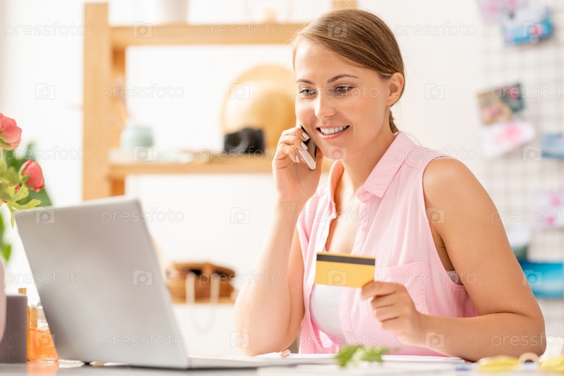 Красивая молодая женщина со смартфоном и кредитной картой делает заказ в сети