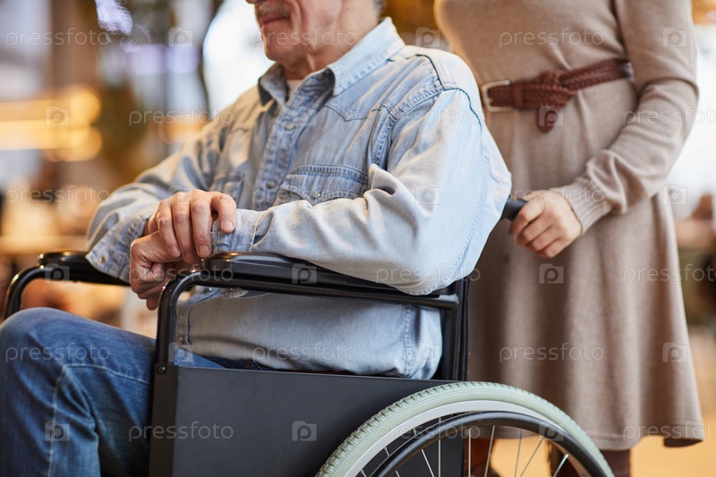 Близкий план женщины-добровольца в платье, толкающей пожилого человека на инвалидном кресле во время работы с мужчиной-инвалидом в доме престарелых