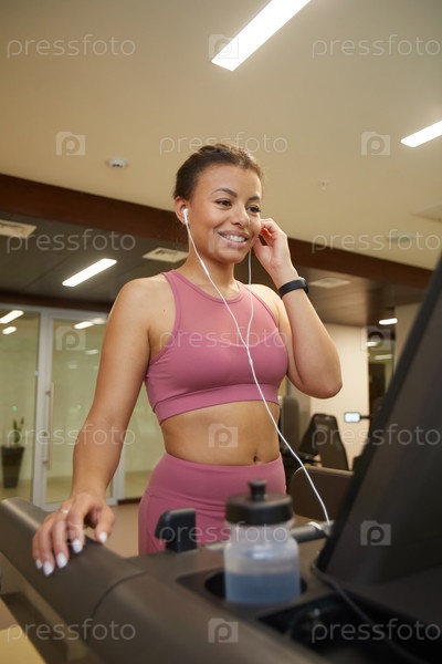 Улыбающаяся женщина бегает на беговой дорожке