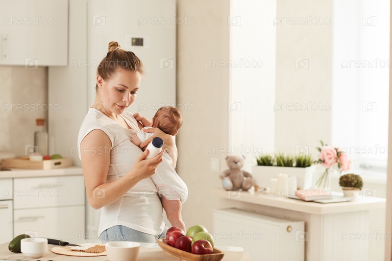 Молодая мать стоит на кухне с ребенком в руках и читает о детской смеси на бутылке