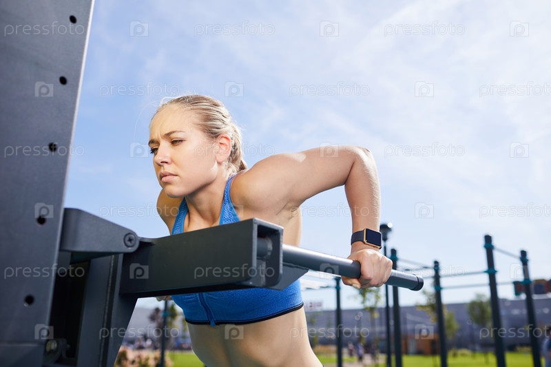 Концентрированная красивая леди с светлыми волосами, практикующая стрип-ап на параллельных барах на открытой площадке с тренажерным оборудованием
