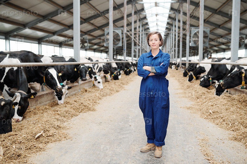 Красивая молодая сельхозработница в рабочей одежде стоит в длинном коридоре большой конюшни
