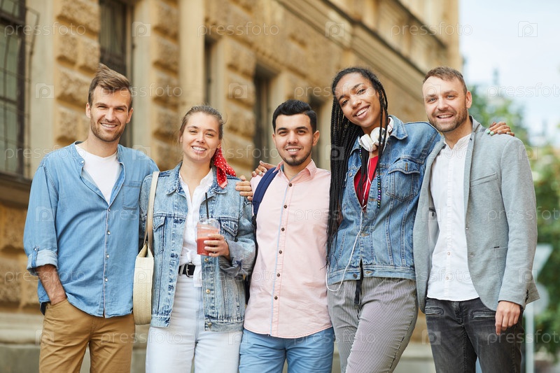 Группа счастливых молодых межнациональных друзей в непринужденной одежде, обнимающих друг друга и смотрящих на камеру во время прогулки по городу