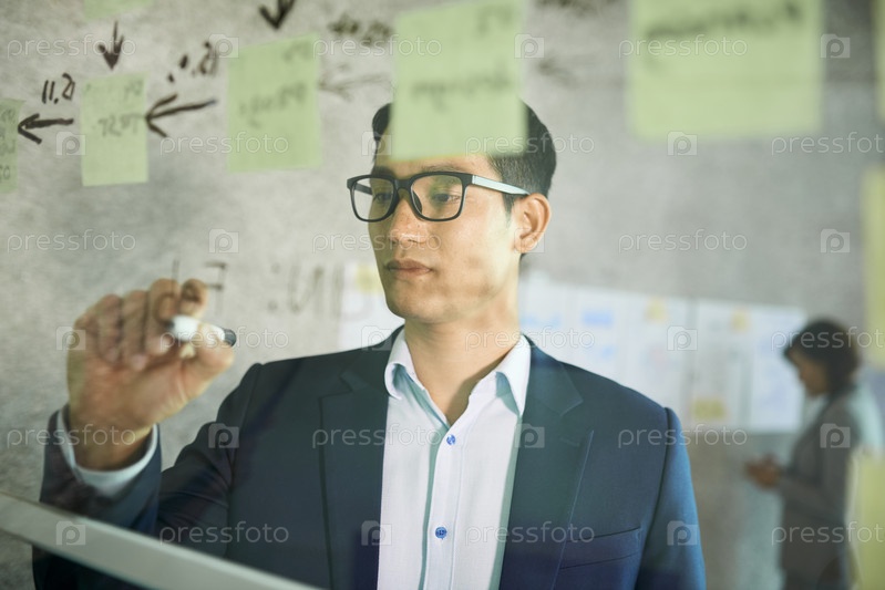 Бизнесмен рисует на стеклянной стене