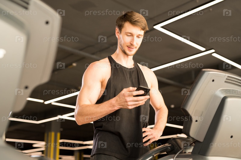 Мужчина отдыхает с телефоном после тренировки