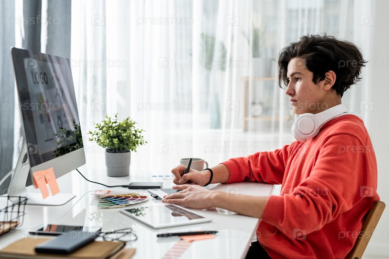 Молодой серьезный мужской дизайнер сидит за столом и ретуширует фотографию или логотип