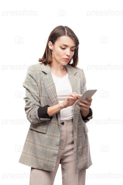 Молодая серьезная мобильная женщина в формальной одежде прокручивает гаджет