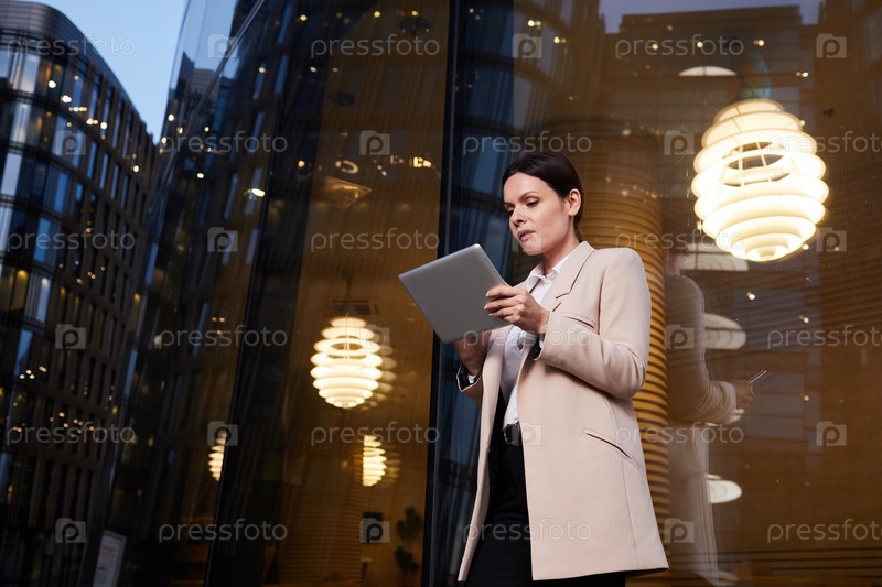 Серьезно сконцентрированная бизнесвумен средних лет, использующая планшет при работе с онлайн-информацией