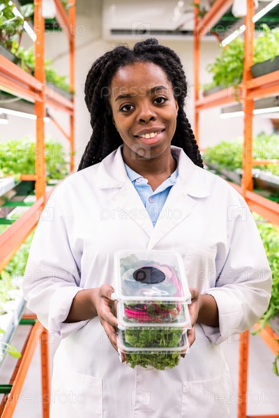 Успешная африканская женщина-агроном держит кучу пластиковых контейнеров