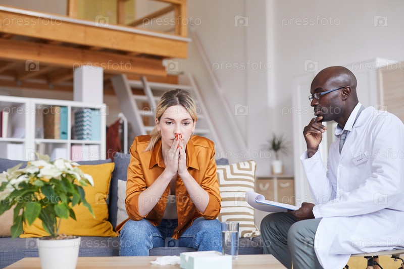 Вдумчивая озадаченная молодая женщина в оранжевой блузке сидит на диване и держит ладони вместе, думая о психологических проблемах во время сеанса терапии