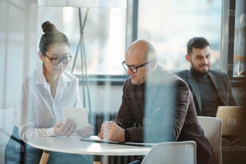 Азиатская бизнесвуменка делает презентацию зрелому коллеге на рабочей встрече