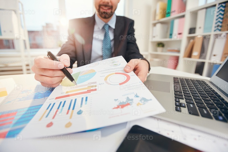 Бизнесмен указывает на статистические данные Closeup