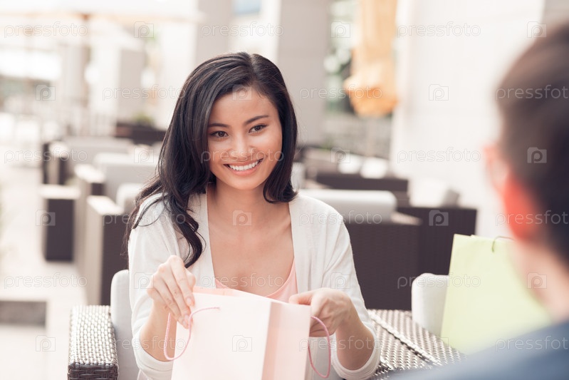 Красивая женщина, открывающая бумажный пакет