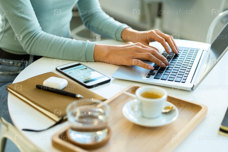 Руки молодой деловой женщины или фрилансера в casualwear сети в кафе