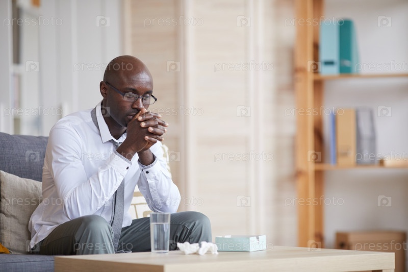 Сбитый с толку молодой лысый афроамериканец в очках сидит на диване в кабинете психолога и опирается головой на руки, размышляя над проблемами