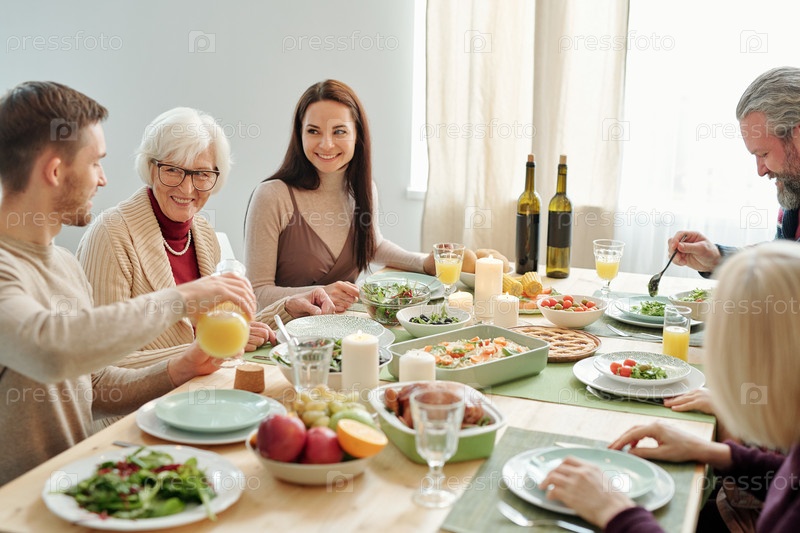 Молодой человек наливает апельсиновый сок своей бабушке во время семейного ужина за ужином