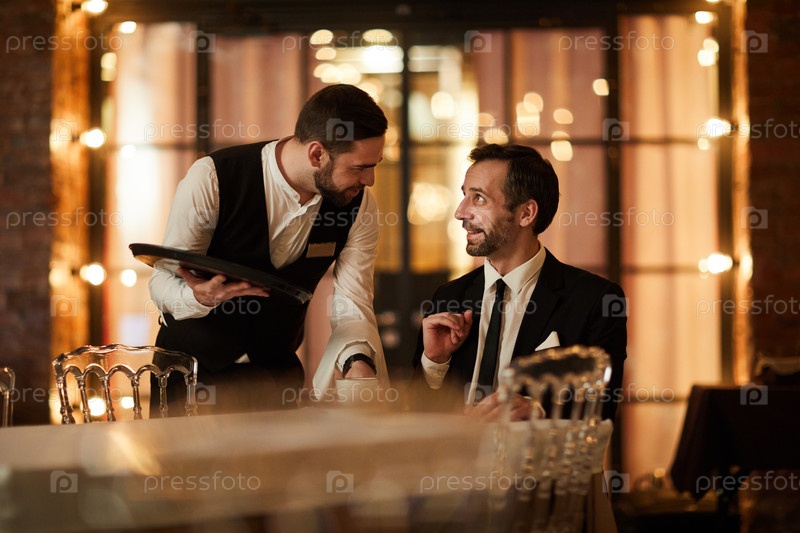 Улыбающийся бизнесмен разговаривает с официантом в ресторане