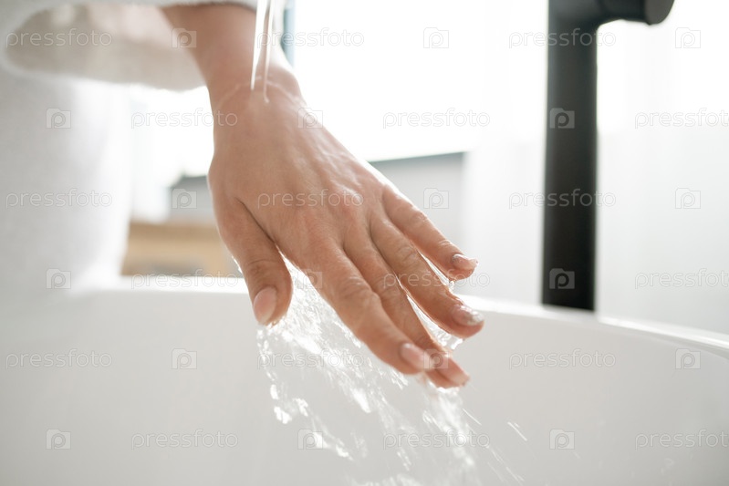 Рука молодой женщины под чистой теплой водой, текущей из крана в ванну
