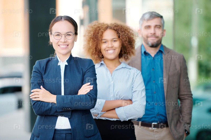 Молодая веселая бизнес-лидер в формальной одежде и ее команда за спиной смотрят на вас