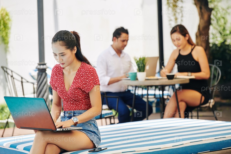 Молодая женщина программирует на свежем воздухе
