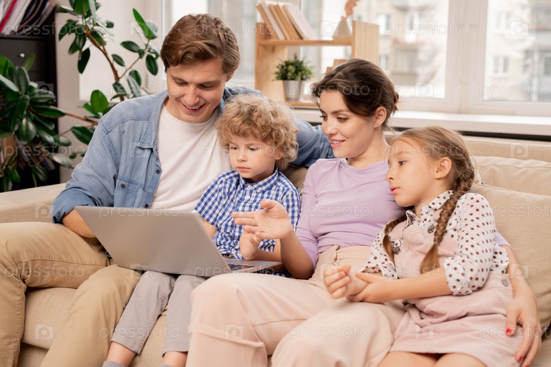Современная пара и два ребенка обсуждают фильм, пока смотрят его в свободное время