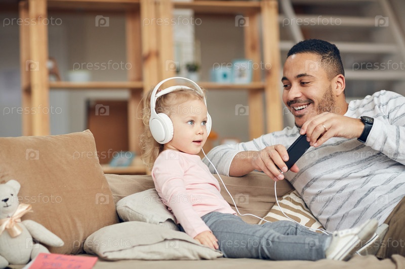 Маленькая девочка слушает музыку с папой
