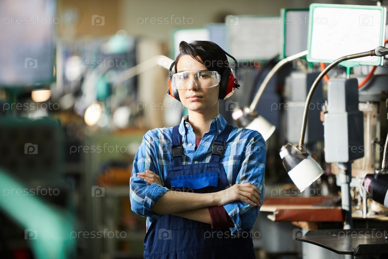 Серьезная грубая женщина в защитных очках и ушных протекторах, стоящая в промышленном магазине и скрестившая руки на груди, глядя в камеру