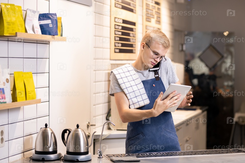 Загруженный молодой мобильный бариста принимает заказы онлайн-клиентов и по телефону