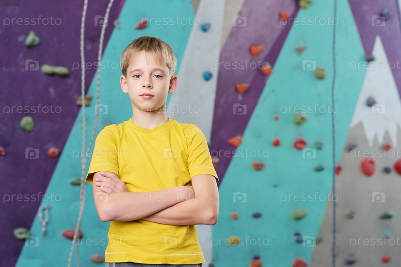 Серьезный школьник скрещивает руки за грудь, стоя перед камерой