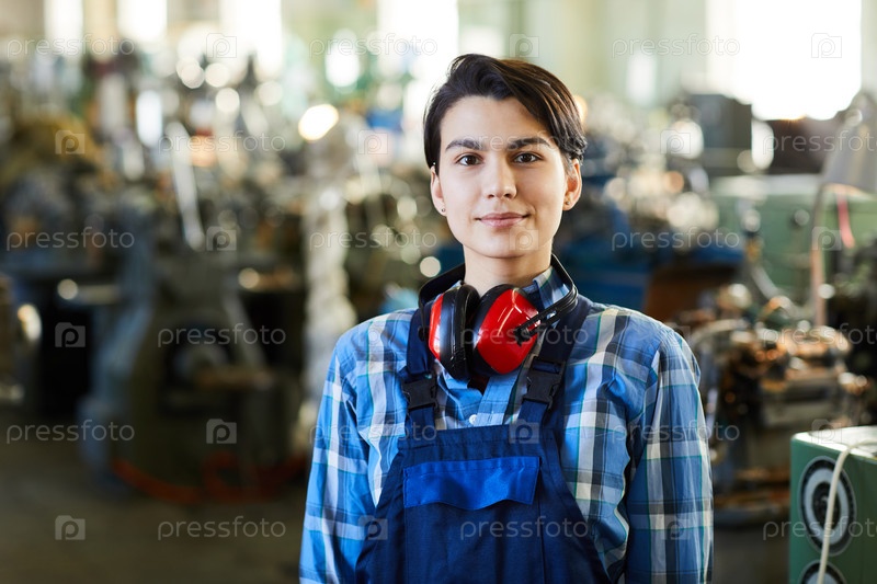 Контент привлекательная мужская женщина с короткими волосами, носящая защитники ушей на шее, стоящая в фабричном магазине и смотрящая на камеру