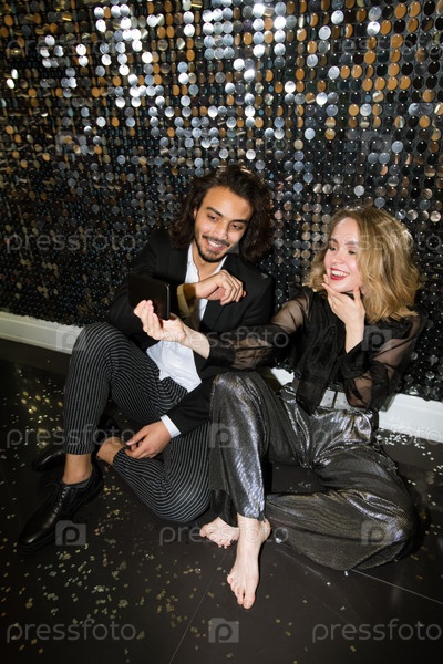 Счастливая молодая гламурная пара делает селфи, сидя у блестящей стены