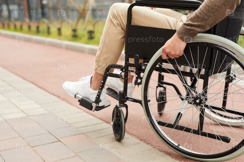 Близкий план неузнаваемого мужчины в бежевых джинсах, которому трудно ходить сидя на современном инвалидном кресле на открытом воздухе