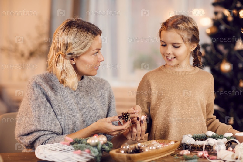 Привлекательная молодая блондинка-мать сидит за столом и обсуждает естественные украшения для рождественского венка с дочерью дома