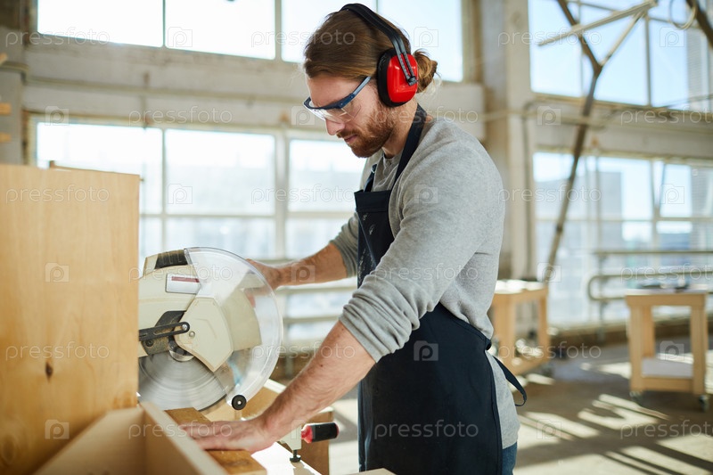 Серьезный концентрированный красивый хипстер плотник в защитных ушах, стоящий на рабочей скамейке и использующий круговую пилу в мастерской
