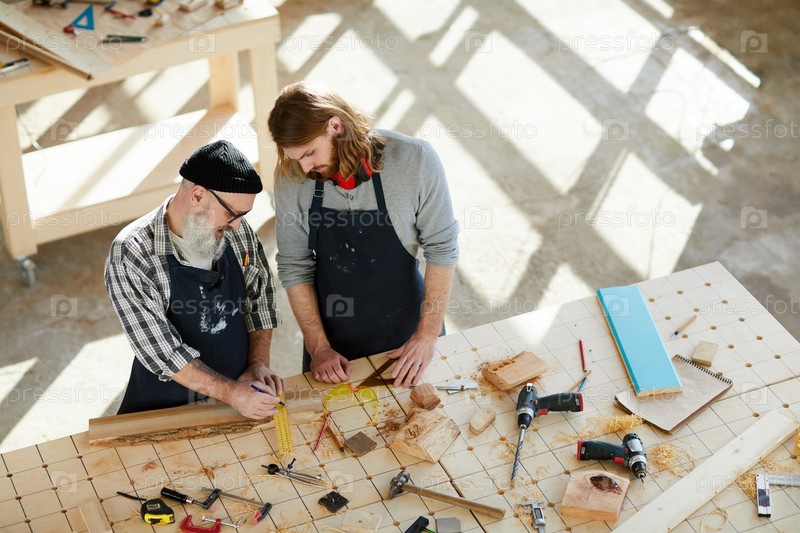 Непосредственно над видом серьезного старшего плотника в шапке и очках, стоящего за столом и делающего отметки на деревянной доске с помощью линейки и карандаша, молодой человек смотрит на этот процесс