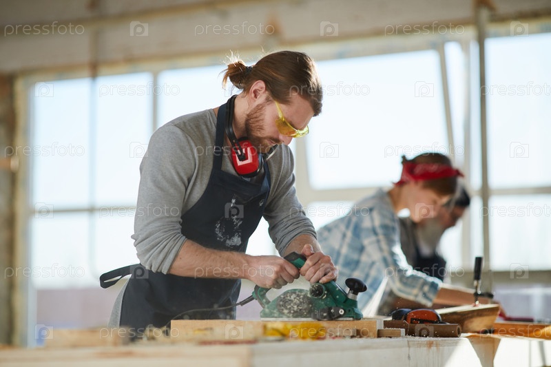 Серьезный концентрированный хипстер бородатый ремесленник в защитных очках, стоящий за столом на мастерской и полирующий древесину шлифовкой