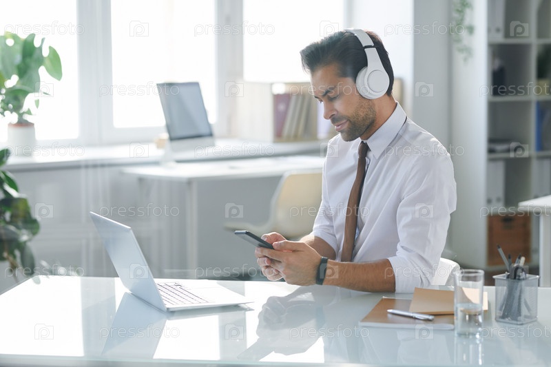Элегантный офисный работник в наушниках, смотрящий на плейлист