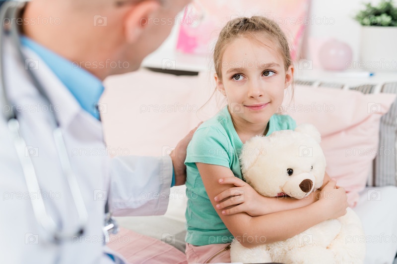 Милая маленькая девочка смотрит на своего врача с улыбкой, слушая его