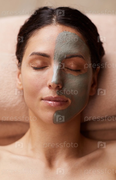 Близкий снимок контента Красивая молодая женщина с маской на половине лица, лежащая со закрытыми глазами при процедуре красоты