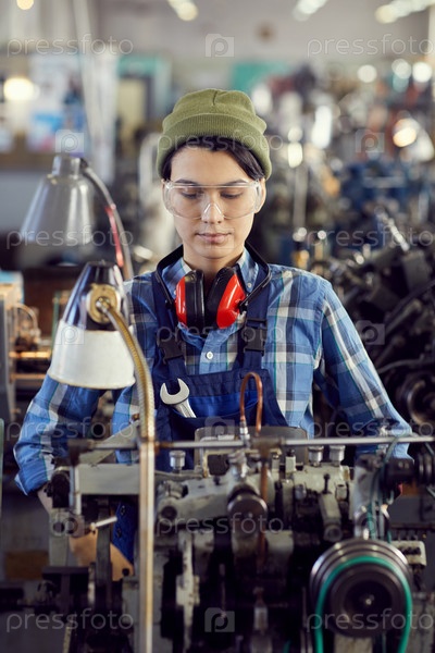 Серьезно сконцентрированная молодая женщина-механик в защитных очках и хипстерской шляпе, стоящая на промышленной мастерской и ремонтной машине