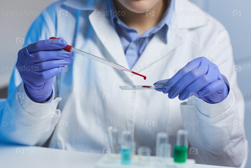Близкий план неузнаваемого лаборанта в белом пальто, сидящего за столом и использующего капельницу во время проверки образца крови