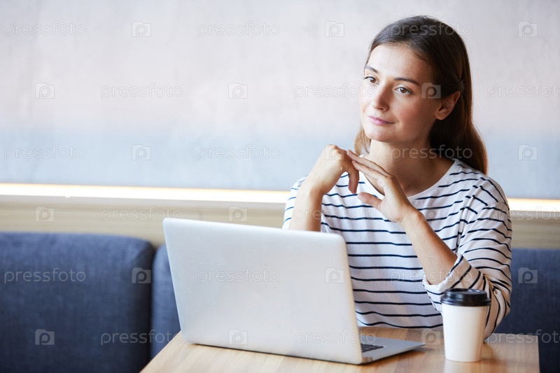 Контент привлекательный молодой специалист по социальным сетям в свитере сидит за столом с ноутбуком и чашечкой кофе в кафе, она работает из офиса