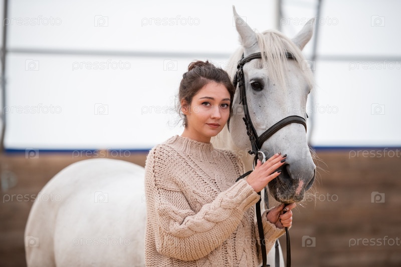 Спокойная молодая неформальная женщина в вязанном свитере, стоящая возле белого чистокровного коня