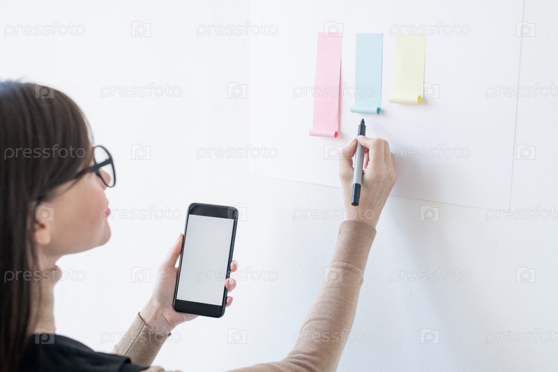 Молодая женщина-брокер со смартфоном и маркировщиком смотрит на бумажный график