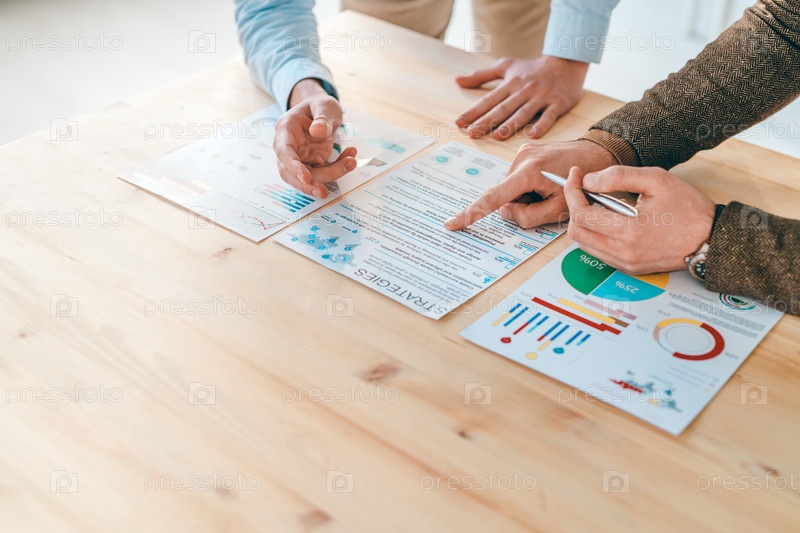 Один из молодых мужчин-финансистов указывает на документ с финансовой информацией