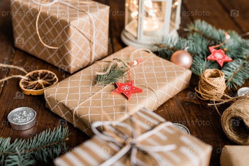 Упакованный подарочный ящик с убранством хвойных деревьев и красной звезды вверху среди рождественских вещей