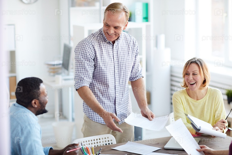Веселый, взволнованный бизнес-специалист показывает результаты отчетов и смеется вместе с коллегами на встрече