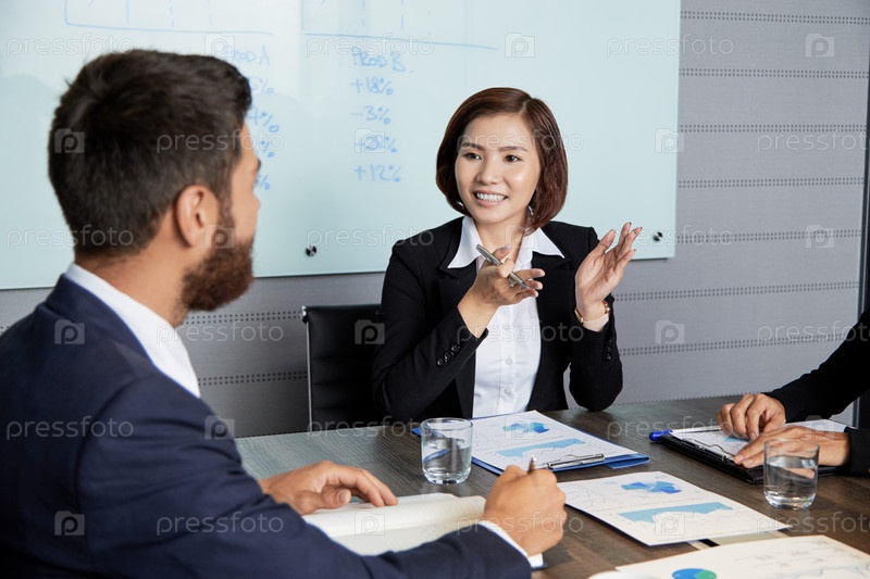 Позитивная деловая женщина разговаривает с коллегой на встрече