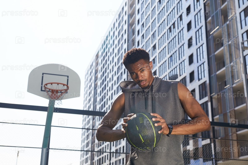 Красивый африканский спортсмен на баскетбольной площадке